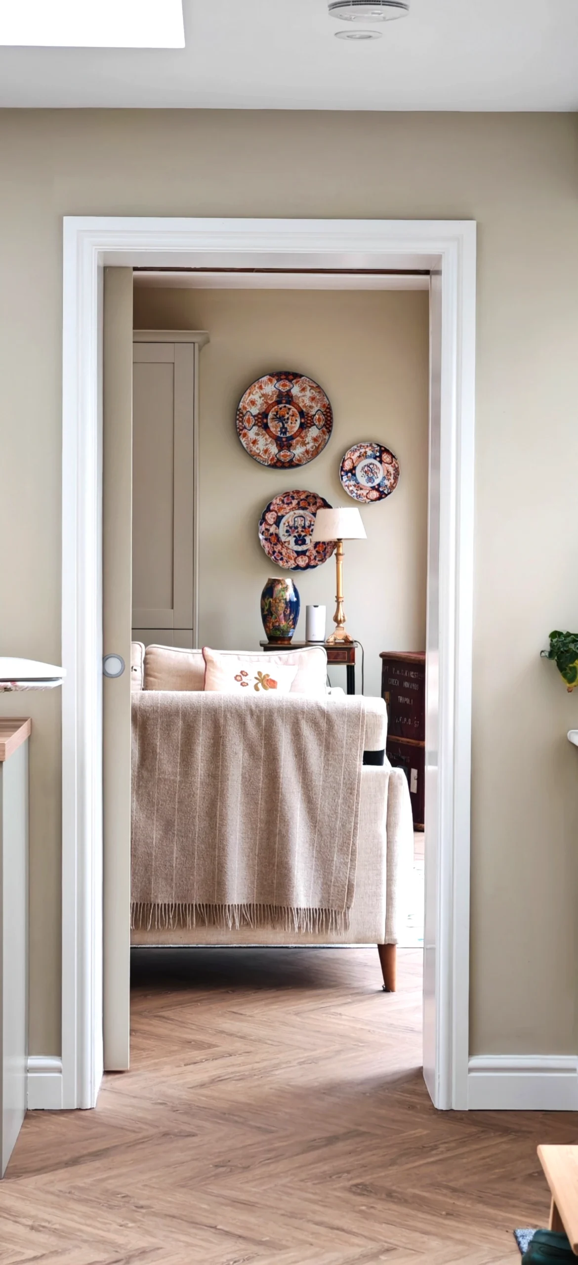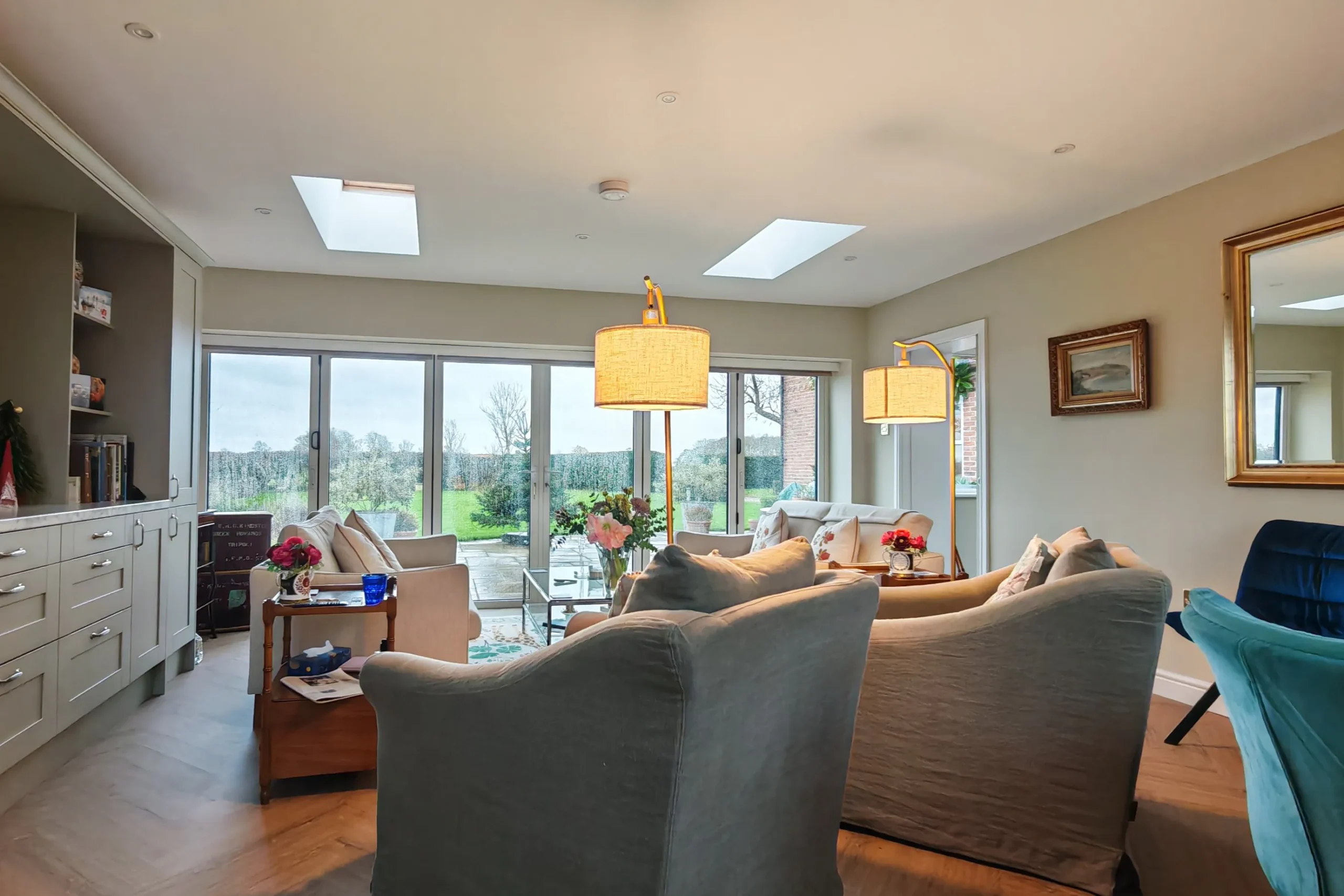 The existing garage openings were retained and repurposed to maximise natural light into the converted space. Additional openings were introduced to provide access, further light, and to frame an excellent view of the surrounding gardens and countryside. The glazed link ties it all together — a bright, generous corridor that feels like a natural part of the home rather than an afterthought.