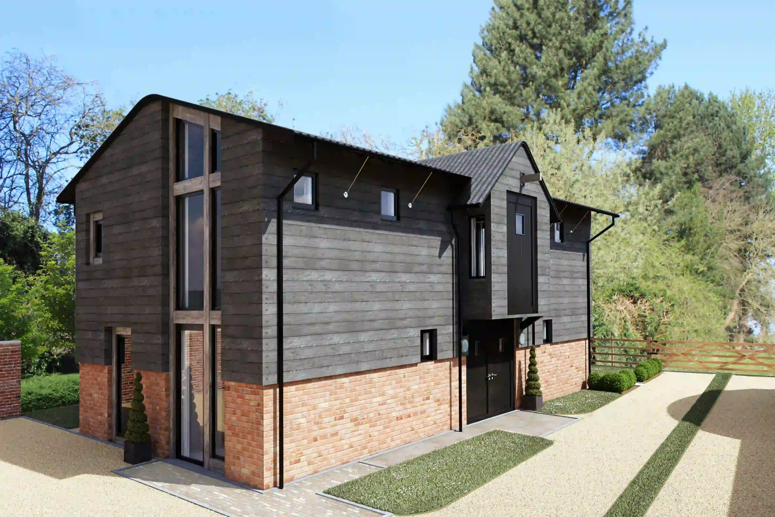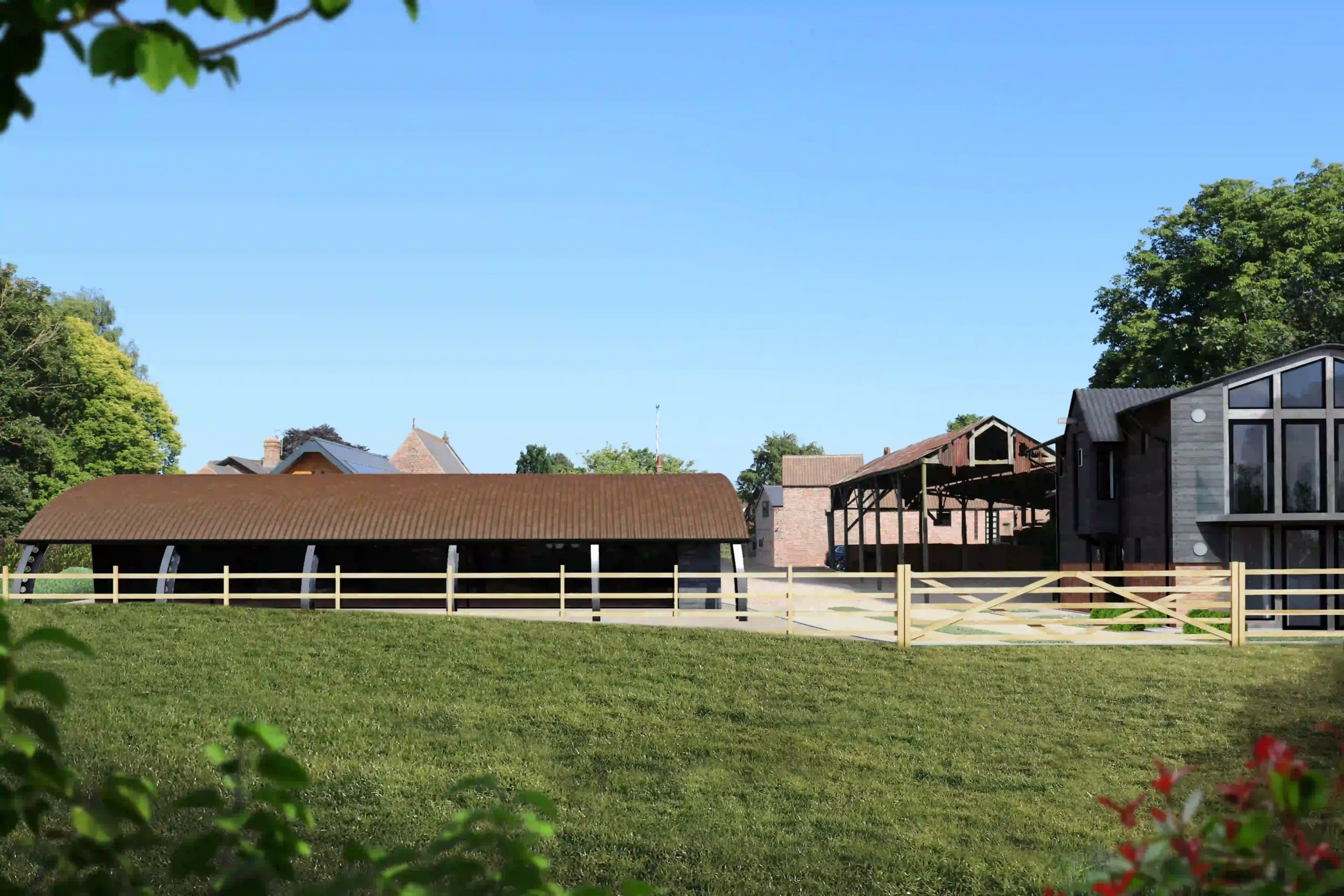 Our wider scheme also includes the careful restoration of the existing large pole barn and the repurposing of an intrusive 1970s small hay barn into a dedicated car and cycle store.