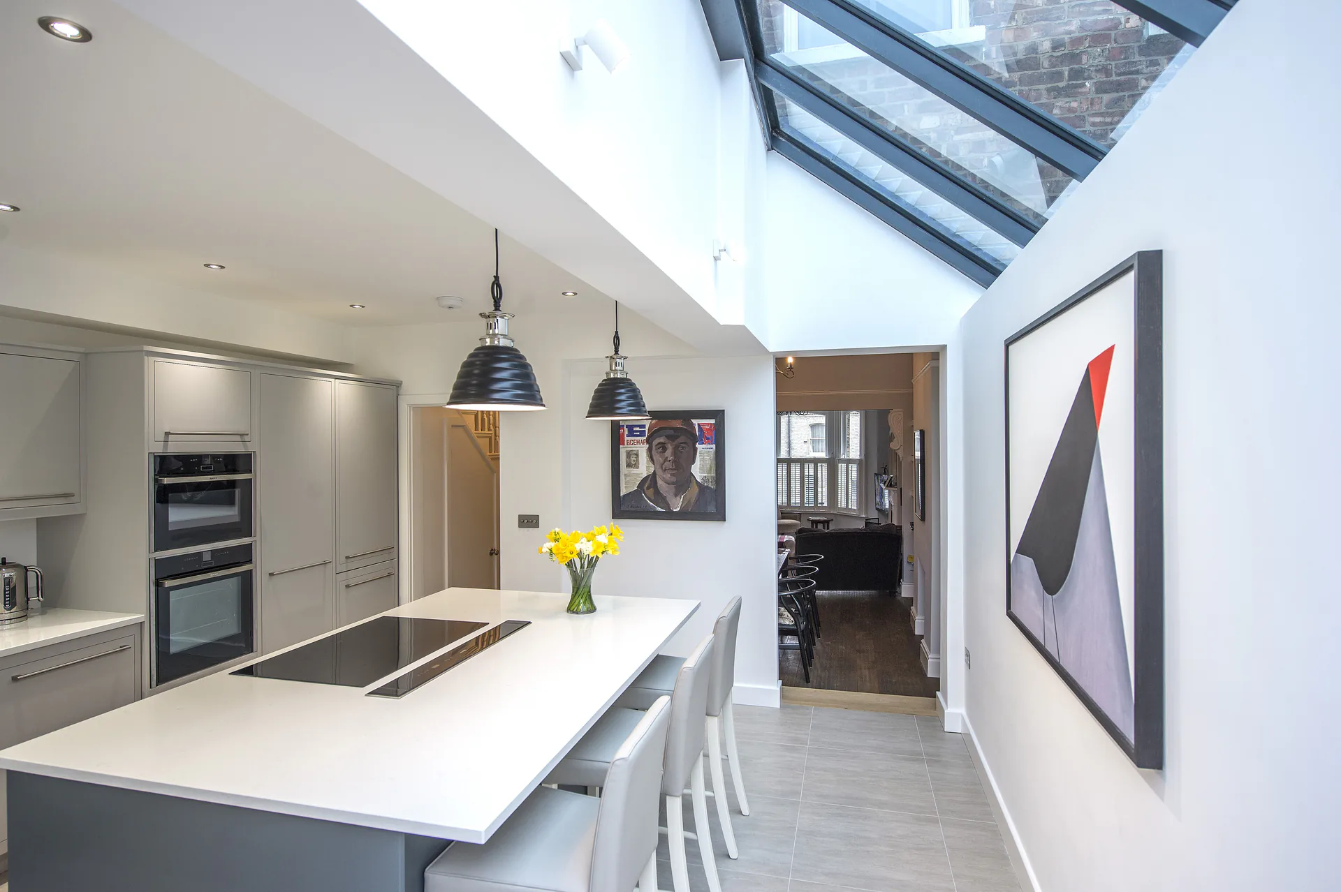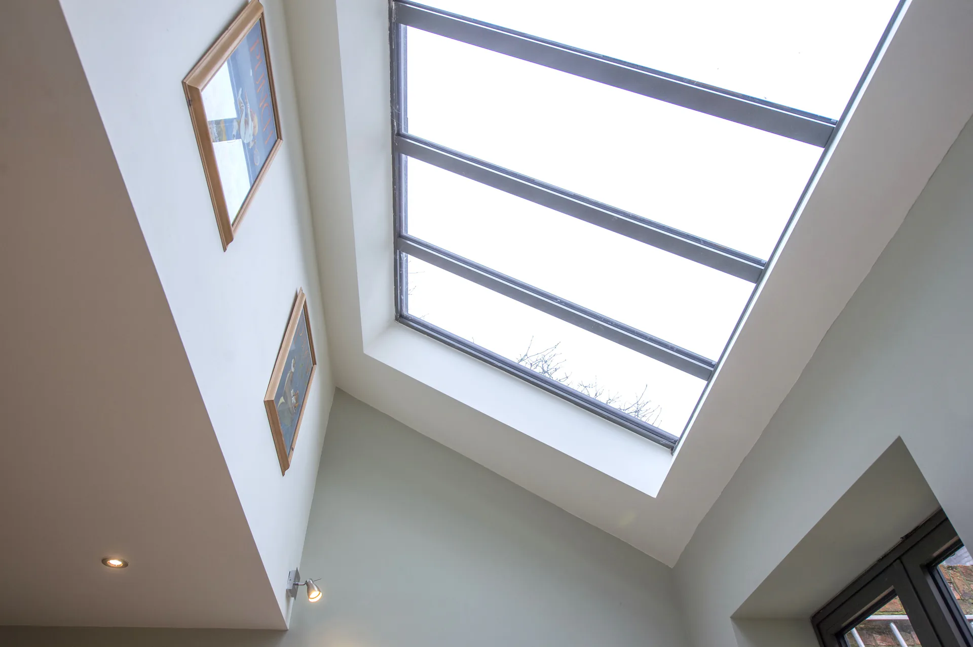 - The Glazed Roof: The new element features a glazed lean-to roof with dark grey powder-coated aluminium framing, bringing daylight directly into the core of the home.